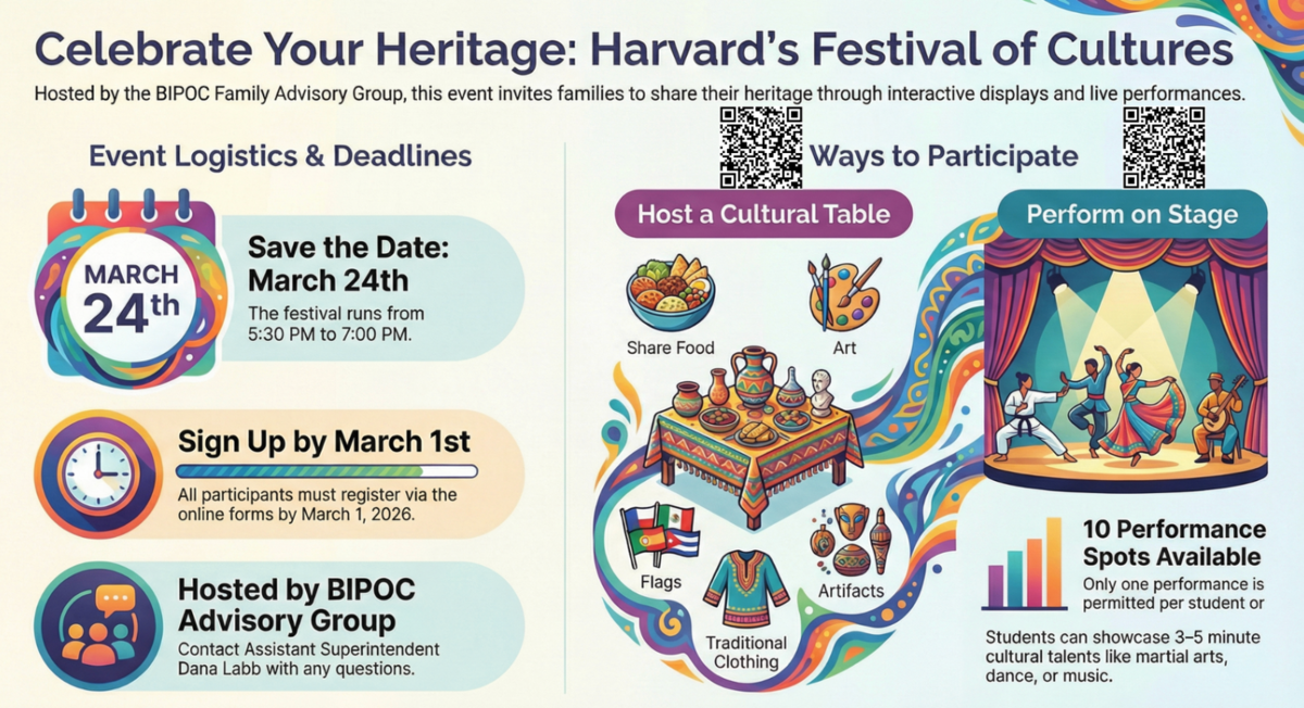 As part of our commitment to advancing diversity, equity, and inclusion across our district, we continue to prioritize meaningful family and community engagement that promotes the learning and growth of all students and the success of all staff. We are excited to invite you to join us for Harvard’s Festival of Cultures, hosted by the BIPOC Family Advisory Group, on Tuesday, March 24, from 5:30–7:00 PM. This family event celebrates the rich diversity of our community and depends on family participation to make it a success.